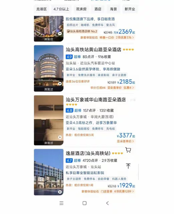 2月17日至19日的酒店败露,汕头万象城华山南路亚朵酒店还是涨到3377元,不少酒店价钱也在2000元至3000元控制。同时,当地多家亚朵酒店房价也突破2000元,该网友直呼,“涨得太夸张!”