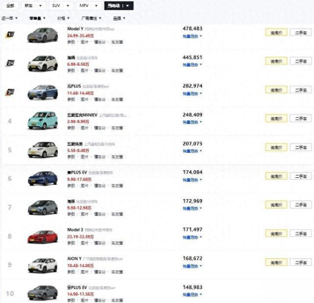 还有比亚迪家的元(11.68~14.48W),近一年集会销量为282974台位居第3名。秦PLUS EV(9.98~17.68W)的174084台和海豚(9.98~12.98W)的172696台,宋PLUS EV(14.98~17.58W)的148983台,分裂位居榜单的第6、第7、第10名。