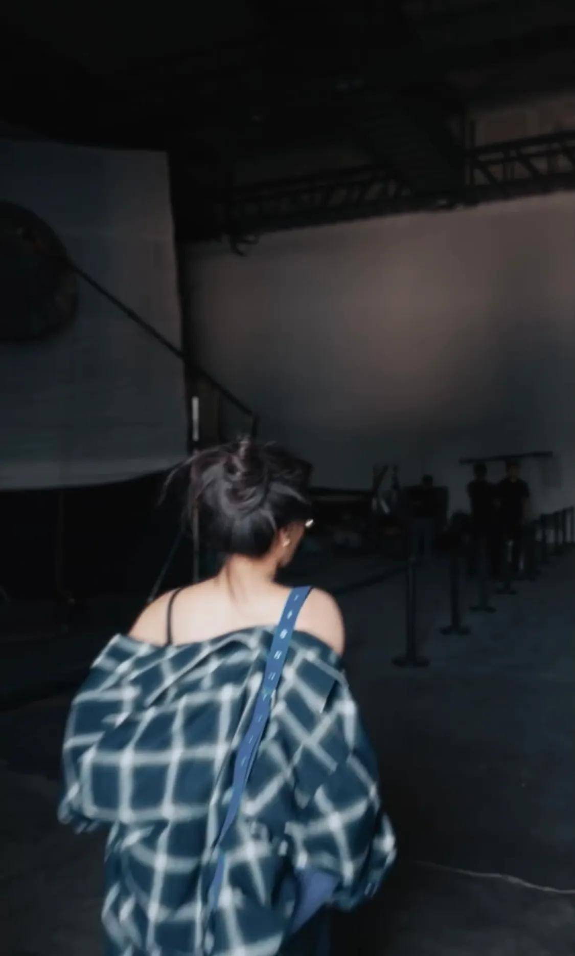 马想纯扎着高丸子头,她穿深蓝格纹衬衣,露着漂亮的肩膀,她这样穿很漂亮。马想纯瘦了,她说她日间基本不吃东西,她这样瘦没少挨饿啊。