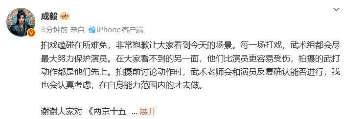 11月27日晚,演员成毅发文报祥瑞:“拍戏磕碰在所不免,相当对不起让众人看到今天的场景。每一场打戏,技击组皆会尽最大起劲保护演员。在众人看不到的另一面,他们比演员更容易受伤,拍摄的武打四肢皆是他们先上。拍摄前接头四肢时,技击憨厚会和演员反复证据能否进行,我也会负责筹议,在自己才略范围内的才去作念。”