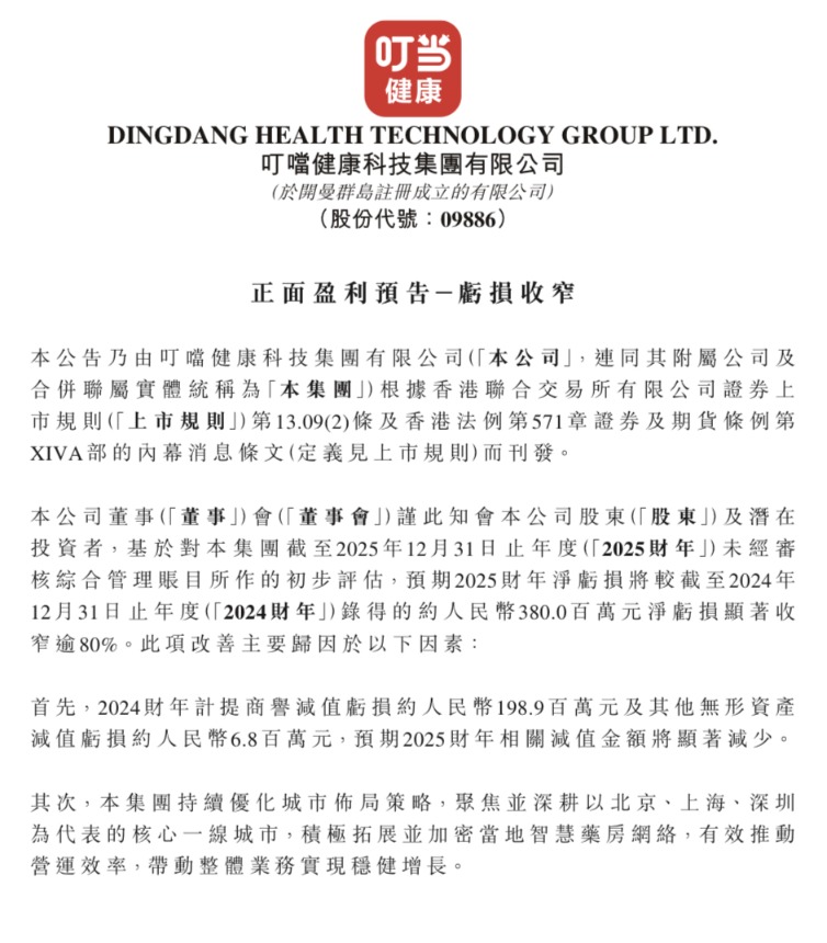 2月20日,叮当健康(09886)发布公告,瞻望2025财年净损失将显贵收窄逾80%,较2024财年约3.8亿元的净损失有昭着改善。